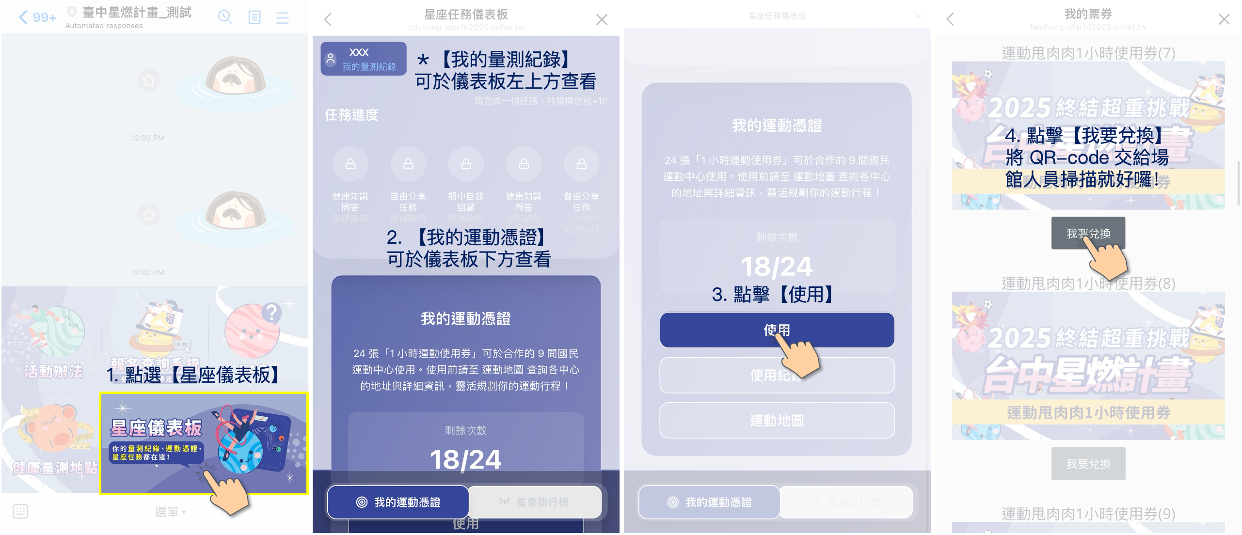 從活動官方LINE@帳號下方選單,點選「我的量測紀錄」,即可於「我的運動憑證」查看並使用
